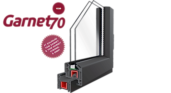 - Tüm ana profilleri 70 mm genişliğe ve B sınıfı et kalınlığına sahip Garnet Sisteminde Yeni Garnet Strong 3 contalı tasarımıyla 70’lik serilerde maksimum yalıtım değerleri sağlıyor.
